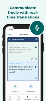 স্বাস্থ্যসেবা পেশাদাররা **Care to Translate** কে বেছে নেন এর অসাধারণ ক্ষমতার জন্য। এর রিয়েল-টাইম ভয়েস অনুবাদ বৈশিষ্ট্যটি অত্যাধুনিক AI প্রযুক্তির মাধ্যমে চালিত হয়, যা নির্বিঘ্ন কথোপকথন সম্ভব করে তোলে এবং রোগীর কোনো তথ্য সংরক্ষণ করে না। চিকিৎসা বিশেষজ্ঞদের দ্বারা যাচাইকৃত বাক্যাংশগুলি নিশ্চিত করে প্রতিটি অনুবাদ নির্ভুল ও নির্ভরযোগ্য। টেক্সট, অডিও এবং ইমেজের মাধ্যমে সহায়তার পাশাপাশি, এটি ২৪/৭ ব্যবহারযোগ্য – এমনকি অফলাইনেও। আপনার কর্মপ্রবাহকে সহজ করতে, দ্রুত অ্যাক্সেসের জন্য কাস্টমাইজযোগ্য এবং পূর্ব-তৈরি সংলাপ তালিকাগুলি এখানে রয়েছে।