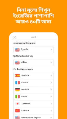 ডুয়োলিংগো, ভাষা বিশেষজ্ঞদের নিপুণ হাতে তৈরি এবং বিশ্বজুড়ে কোটি কোটি শিক্ষার্থীদের আস্থা অর্জনকারী একটি অনন্য শিক্ষা মাধ্যম। স্প্যানিশ, ফ্রেঞ্চ, চাইনিজ, জার্মান, ইংরেজি সহ অসংখ্য ভাষায় সাবলীল আলাপচারিতার দক্ষতা অর্জনের জন্য এটি আপনাকে সম্পূর্ণ প্রস্তুত করবে। ব্যক্তিগত কৌতূহল মেটাতে, বিদেশে ভ্রমণ, পেশাগত সুযোগ বৃদ্ধি, কিংবা প্রিয়জনদের সাথে নতুন সংস্কৃতিতে যোগাযোগের মাধ্যম হিসেবে - যে উদ্দেশ্যেই হোক না কেন, ডুয়োলিংগোতে ভাষা শেখা আপনার জন্য হবে এক আনন্দদায়ক অভিজ্ঞতা।
